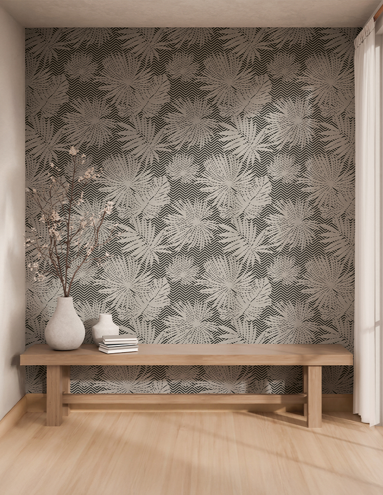 The beauty of ferns intertwines with the concept of fabric through a registered embossing that replicates the texture of a natural fabric. The overlap of two distinct patterns, chevron and fern leaf, creates an organic design that recalls the harmony of nature, with a refined and distinctive accent.