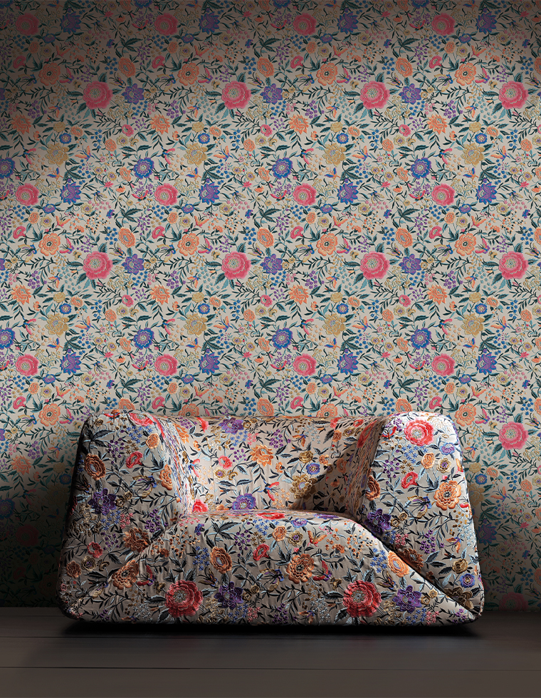 A historic design from the Missoni house, Oriental Garden celebrates the grace and liveliness of a blooming garden, reinterpreting the ancient silk embroidery that inspired the original fabric. The pattern, rich in details and color harmonies, evokes an exotic landscape where flowers and leaves intertwine in a refined balance.
