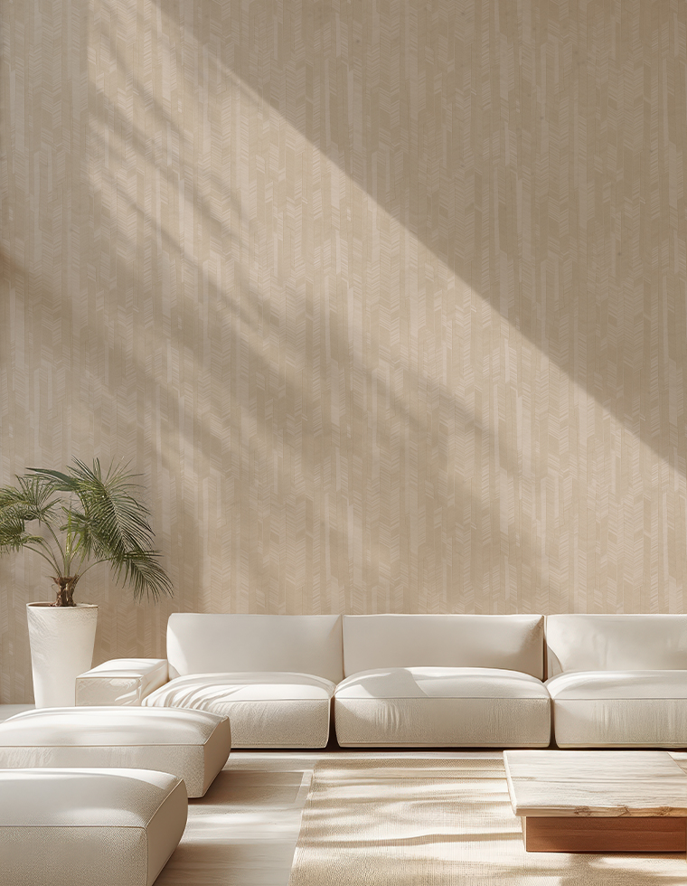A sophisticated play of fabrics and geometries, where the chevron is deconstructed and reinterpreted in multicolor and tone-on-tone versions. Printed and registered embossed, the design presents a textile effect that ranges from a lively and dynamic interpretation to a more sober and unified one. A perfect balance between tradition and modernity.
