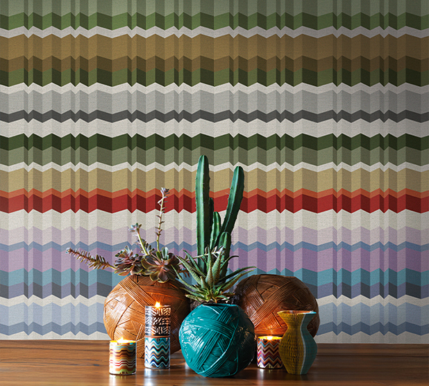 Wallcoverings02 MissoniHome ha un mood moderno, dal sapore autentico, che miscela la palette di colori che caratterizza storicamente la Maison Missoni.
